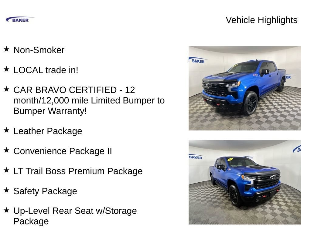 New Price! Glacier Blue Metallic 2023 Chevrolet Silverado 1500 LT Trail Boss 4WD 10-Speed Automatic 3.0L I6 Non-Smoker, LOCAL trade in!, CAR BRAVO CERTIFIED - 12 month/12,000 mile Limited Bumper to Bumper Warranty!, Silverado 1500 LT Trail Boss, 3.0L I6, 10-Speed Automatic, 4WD, Glacier Blue Metallic, Gideon/Very Dark Atmosphere Leather, 10-Way Power Driver Seat w/Lumbar, 120-Volt Bed Mounted Power Outlet, 120-Volt Instrument Panel Power Outlet, 3.23 Rear Axle Ratio, Adaptive Cruise Control, Apple CarPlay/Android Auto, Automatic Emergency Braking, Bluetooth® For Phone, Chevrolet Connected Access Capable, Chevytec Spray-On Black Bedliner, Convenience Package II, Dual Exhaust w/Polished Outlets, Dual-Zone Automatic Climate Control, Electronic Transmission Range Selector Shifter, EZ Lift Power Lock & Release Tailgate, HD Rear Vision Camera, HD Surround Vision, Heated front seats, Heated Steering Wheel, Hitch Guidance, Hitch Guidance w/Hitch View, Integrated Trailer Brake Controller, Lane Keep Assist w/Lane Departure Warning, Leather Package, LT Trail Boss Premium Package, Off-Road High Clearance Steps (LPO), Power driver seat, Power Sliding Rear Window w/Rear Defogger, Power Sunroof, Power Tailgate, Premium audio system: Chevrolet Infotainment 3 Premium, Premium Bose 7-Speaker Sound System, Protection Package, Radio: Chevrolet Infotainment 3 Premium System, Rear Park Assist, Safety Package, Trailer Camera Provisions, Trailering Package, Up-Level Rear Seat w/Storage Package, Wheels: 20 x 9 High Gloss Black Painted Alum, Wireless Charging, Wireless Phone Projection.