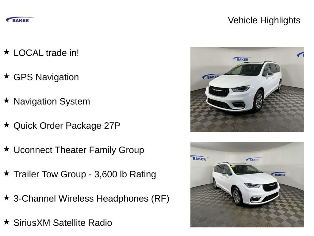 New Price! Bright White Clearcoat 2021 Chrysler Pacifica Limited AWD 9-Speed 948TE Automatic 3.6L V6 24V VVT LOCAL trade in!, Pacifica Limited, 3.6L V6 24V VVT, 9-Speed 948TE Automatic, AWD, Bright White Clearcoat, Black/Alloy/Black Leather, 10.1 Touchscreen Display, 115V Auxiliary Power Outlet, 3-Channel Video Remote Control, 3-Channel Wireless Headphones (RF), 7 & 4 Pin Trailer Tow Wiring Harness, Apple CarPlay, Automatic temperature control, Blu-Ray/DVD Player/USB Port, Exterior Mirrors w/Memory, Famcam Interior Camera, Front dual zone A/C, Google Android Auto, GPS Navigation, Heated front seats, Heated rear seats, High Definition Multimedia Interface, Hitch w/2 Receiver, Integrated Voice Command w/Bluetooth, KeySense, Memory seat, Mid Century Timber Accents, Navigation System, ParkView Rear Back-Up Camera, Power driver seat, Power Liftgate, Power moonroof, Power passenger seat, Quick Order Package 27P, Radio: Uconnect 5 Nav w/10.1 Display, Reclining 3rd row seat, Seatback Video Screens, SiriusXM Satellite Radio, SiriusXM w/360L, Trailer Sway Damping, Trailer Tow Group - 3,600 lb Rating, Uconnect Theater Family Group, USB Host Flip, Ventilated front seats, Video USB Port, Wheels: 18 x 7.5 Polished Aluminum Design 3.