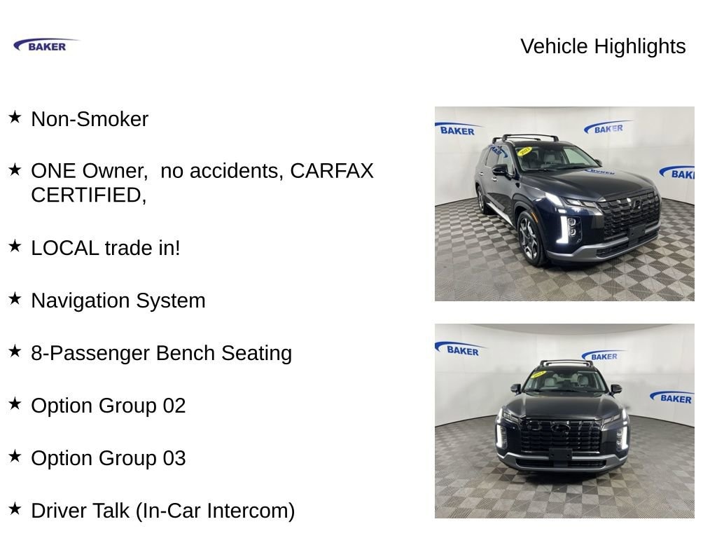 New Price! Moonlight Cloud 2023 Hyundai Palisade SEL AWD 8-Speed Automatic with SHIFTRONIC V6 Non-Smoker, ONE Owner, no accidents, CARFAX CERTIFIED,, LOCAL trade in!, Palisade SEL, V6, 8-Speed Automatic with SHIFTRONIC, AWD, Moonlight Cloud, Gray/Black Artificial Leather, 8-Passenger Bench Seating, 8-Passenger Seating, Apple CarPlay & Android Auto, Driver 4-Way Power Lumbar Support, Driver Talk (In-Car Intercom), Exterior Parking Camera Rear, Front Parking Sensors, H-Tex Leatherette Seat Trim, harman/kardon® Audio System, Heated 2nd Row Seats, Heated Front Bucket Seats, Heated Steering Wheel, Navigation System, Option Group 02, Option Group 03, Power driver seat, Power Liftgate, Power passenger seat, Power Sunroof, Reclining 3rd row seat, Ventilated Front & 2nd-Row Seats, Wheels: 20 x 7.5J Alloy.