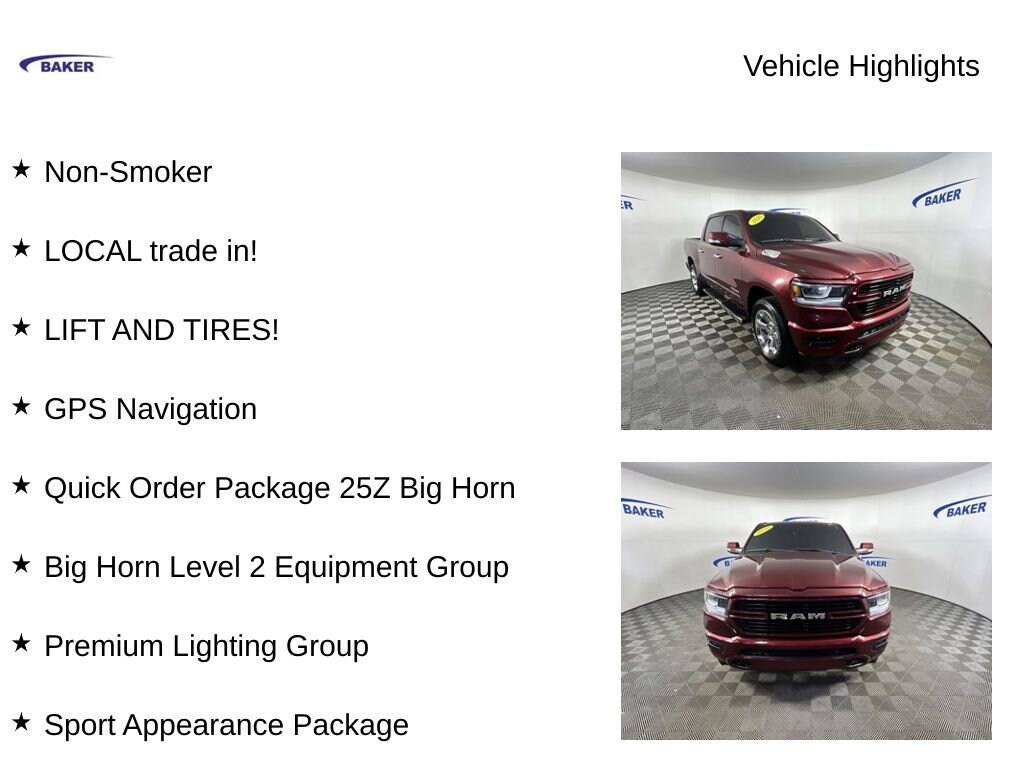 New Price! Delmonico Red Pearlcoat 2020 Ram 1500 Big Horn/Lone Star 4WD 8-Speed Automatic HEMI 5.7L V8 Multi Displacement VVT Non-Smoker, LOCAL trade in!, LIFT AND TIRES!, 1500 Big Horn/Lone Star, 4D Crew Cab, HEMI 5.7L V8 Multi Displacement VVT, 4WD, Delmonico Red Pearlcoat, Black Cloth, 1-Year SiriusXM Radio Service, 115V Auxiliary Power Outlet, 115V Auxiliary Rear Power Outlet, 12 Touchscreen Display, 2 USB Full Function/Charge Only Media Hub, 2nd Row In Floor Storage Bins, 400W Inverter, Air Conditioning ATC w/Dual Zone Control, Big Horn Badge, Big Horn Level 2 Equipment Group, Black Premium Power Mirrors, Body Color Door Handles, Body Color Front Bumper, Body Color Premium Power Mirrors, Class IV Receiver Hitch, Dampened Tailgate, Front LED Fog Lamps, Google Android Auto, GPS Navigation, Grille Surround 1 Body Color Texture 2 Black, HD Radio, Heated Front Seats, Heated Steering Wheel, Integrated Center Stack Radio, LED Reflector Headlamps, LED Taillamps, Manual Adjust 4-Way Front Passenger Seat, ParkSense Front/Rear Park Assist w/Stop, Power 4-Way Driver Lumbar Adjust, Power Adjustable Pedals, Premium Lighting Group, Quick Order Package 25Z Big Horn, Radio: Uconnect 12 w/Navigation, Radio: Uconnect 4 w/8.4 Display, Rear Dome w/On/Off Switch Lamp, Rear Power Sliding Window, Rear Window Defroster, SiriusXM Satellite Radio, SiriusXM Traffic Plus, SiriusXM Travel Link, SiriusXM w/360L, Sport Appearance Package, Sport Decal, USB Host Flip.