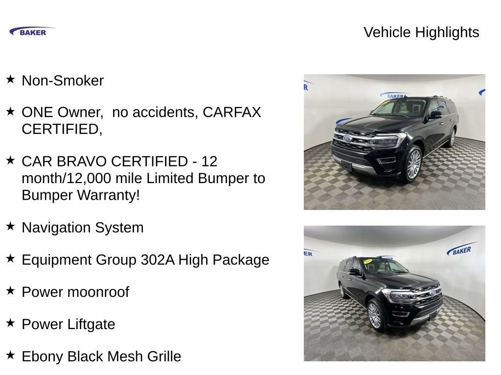 Black Metallic 2024 Ford Expedition Max Limited 4WD 10-Speed Automatic EcoBoost 3.5L V6 GTDi DOHC 24V Twin Turbocharged Non-Smoker, ONE Owner, no accidents, CARFAX CERTIFIED,, CAR BRAVO CERTIFIED - 12 month/12,000 mile Limited Bumper to Bumper Warranty!, Expedition Max Limited, 4D Sport Utility, EcoBoost 3.5L V6 GTDi DOHC 24V Twin Turbocharged, 4WD, Black Metallic, Sandstone Leather, Ebony Black Mesh Grille, Equipment Group 302A High Package, Heavy-Duty Independent Suspension, Magnetic-Painted Power Deployable Running Boards, Navigation System, Power Liftgate, Power moonroof, Power-Folding Sideview Mirrors w/Autofold, Wheels: 22 12-Spoke Polished Aluminum.